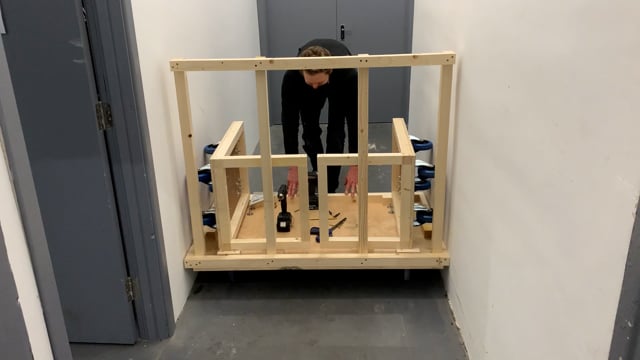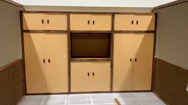 After a little R&D, we built a moving wall on castors- it had to be ultra-smooth, lightweight but solid looking with the capacity to be back lit. The room then appeared to be shrinking and expanding. The lighting department lit through the acrylic cupboard doors.